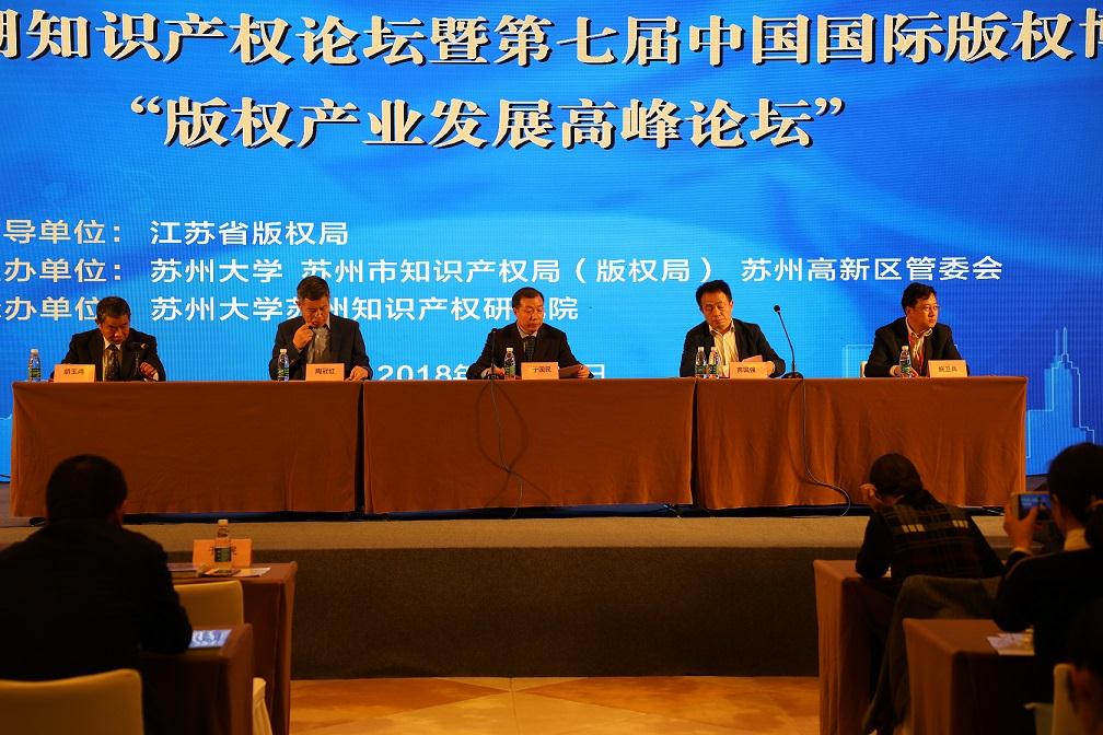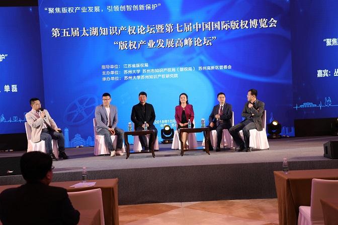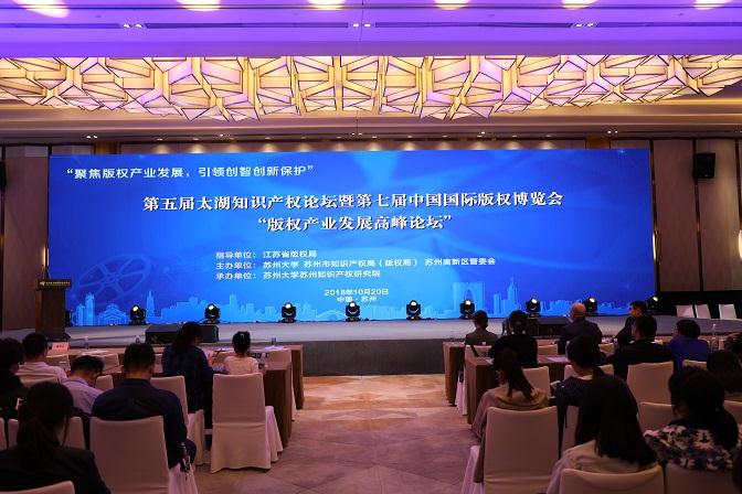 2018年10月20日下午,由苏州大学、苏州市知识产权局、苏州高新区管委会共同主办的第五届太湖知识产权论坛暨第七届中国国际版权博览会“版权产业发展”高峰论坛在苏州国际博览中心成功举办。