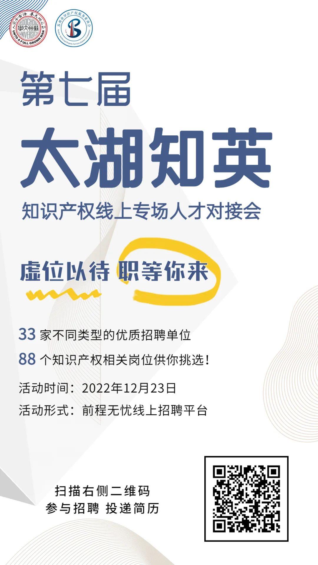 为协助各类求职者及时了解苏州市知识产权人才相关政策,助力招聘单位“吸才引才”,第七届“太湖知英”知识产权线上专场人才对接会线上宣讲会将于12月15日(周四)下午13:30举行,扫描下方二维码即可在线观看。