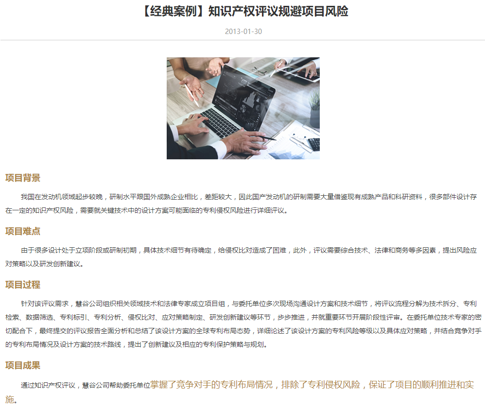 描述:项目背景 我国在发动机领域起步较晚,研制水平跟国外成熟企业相比,差距较大,因此国产发动机的研制需要大量借鉴现有成熟产品和科研资料,很多部件设计存在一定的知识产权风险,需要就关键技术中的设计方案可能面临的专利侵权风险进行详细评议。 项目难点 由于很多设计处于立项阶段或研制初期,具体技术细节有待确定,给侵权比对造成了困难,此外,评议需要综合技术、法律和商务等多因素,提出风险应对策略以及研发创新建议。 项目过程 针对该评议需求,慧谷公司组织相关领域技术和法律专家成立项目组,与委托单位多次现场沟通设计方案和技术细节,将评议流程分解为技术拆分、专利检索、数据筛选、专利标引、专利分析、侵权比对、应对策略制定、研发创新建议等环节,步步推进,并就重要环节开展阶段性评审。在委托单位技术专家的密切配合下,最终提交的评议报告全面分析和总结了该设计方案的全球专利布局态势,详细论述了该设计方案的专利风险等级以及具体应对策略,并结合竞争对手的专利布局情况及设计方案的技术路线,提出了创新建议及相应的专利保护策略与规划。 项目成果 通过知识产权评议,慧谷公司帮助委托单位掌握了竞争对手的专利布局情况,排除了专利