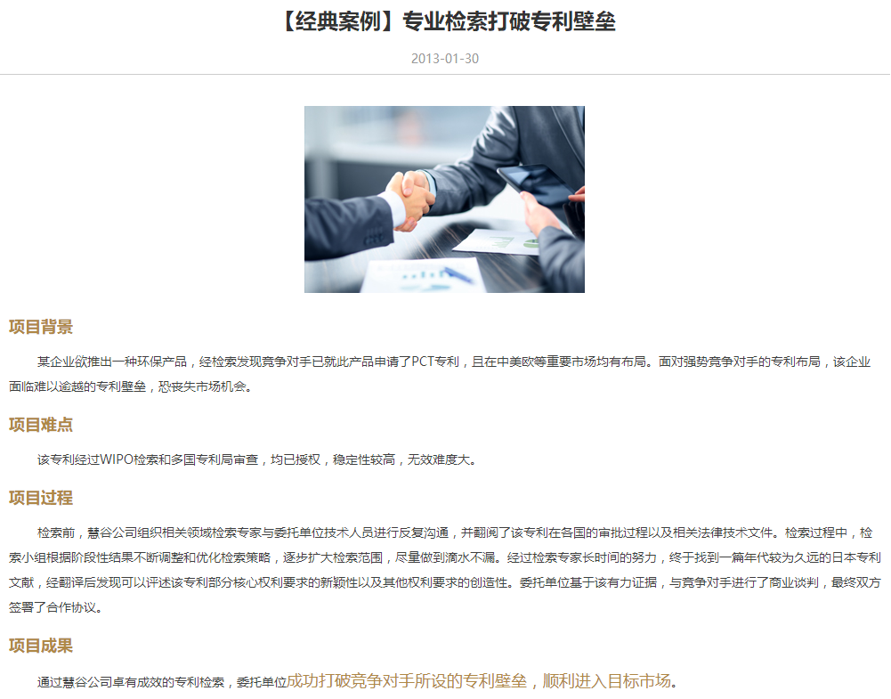 描述:项目背景 某企业欲推出一种环保产品,经检索发现竞争对手已就此产品申请了PCT专利,且在中美欧等重要市场均有布局。面对强势竞争对手的专利布局,该企业面临难以逾越的专利壁垒,恐丧失市场机会。 项目难点 该专利经过WIPO检索和多国专利局审查,均已授权,稳定性较高,无效难度大。 项目过程 检索前,慧谷公司组织相关领域检索专家与委托单位技术人员进行反复沟通,并翻阅了该专利在各国的审批过程以及相关法律技术文件。检索过程中,检索小组根据阶段性结果不断调整和优化检索策略,逐步扩大检索范围,尽量做到滴水不漏。经过检索专家长时间的努力,终于找到一篇年代较为久远的日本专利文献,经翻译后发现可以评述该专利部分核心权利要求的新颖性以及其他权利要求的创造性。委托单位基于该有力证据,与竞争对手进行了商业谈判,最终双方签署了合作协议。 项目成果 通过慧谷公司卓有成效的专利检索,委托单位成功打破竞争对手所设的专利壁垒,顺利进入目标市场。
