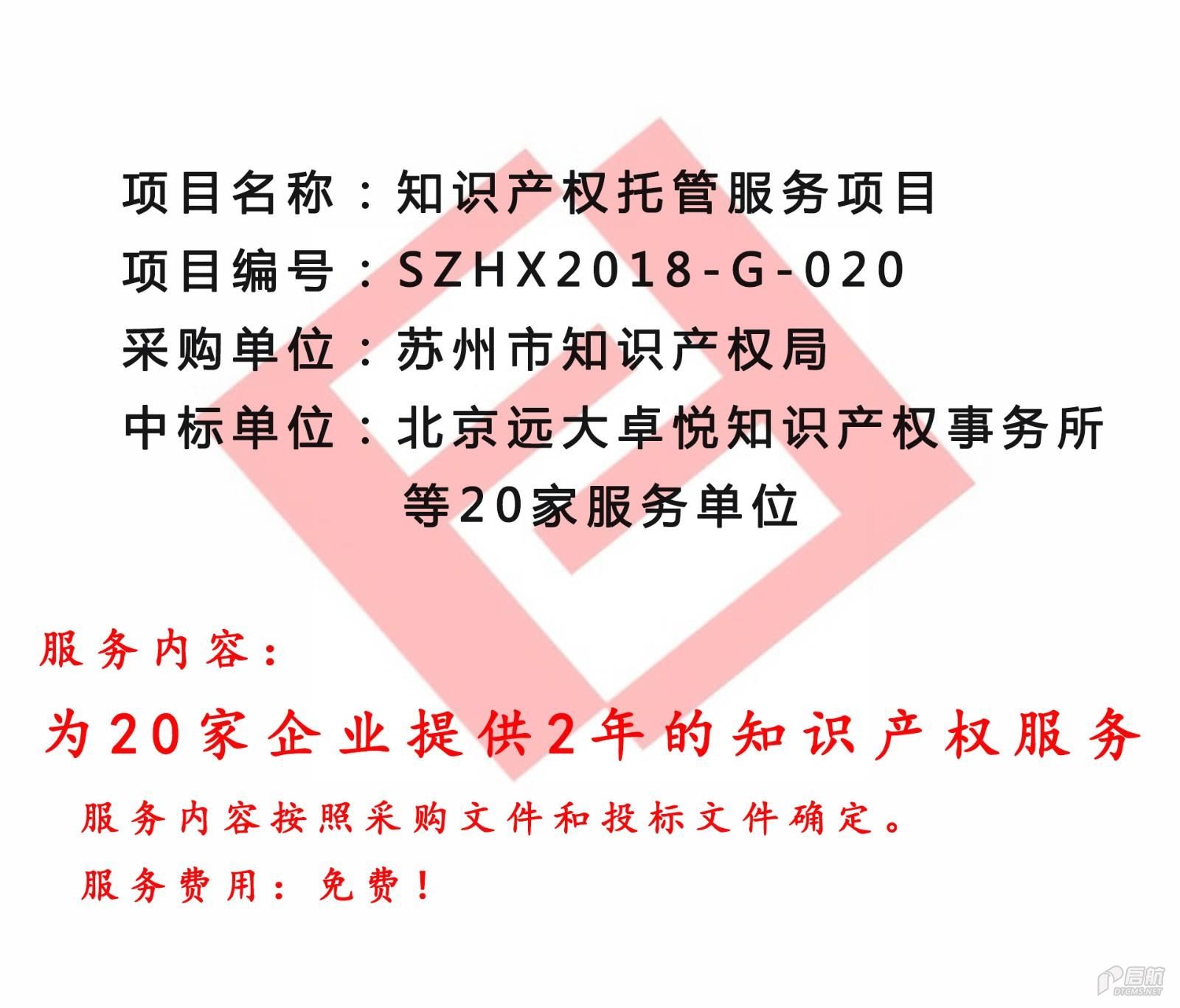 2018年,由苏州市知识产权局向知识产权服务机构采购知识产权托管项目服务,为苏州市内20家企业提供知识产权托管服务。